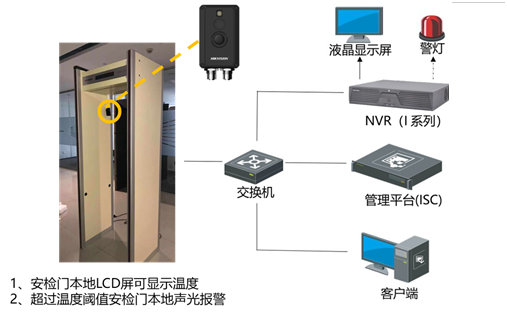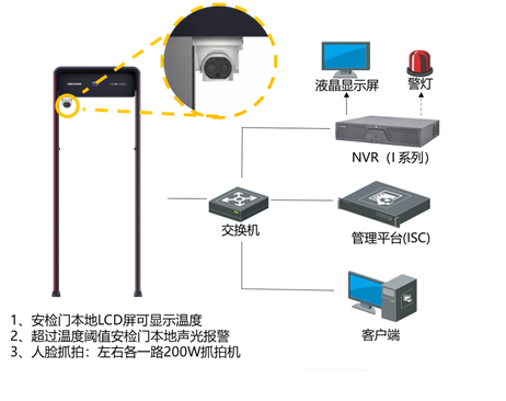 系統(tǒng)功能:通過測(cè)溫人體安檢門上的熱成像相機(jī)(非接觸式方式),初步對(duì)進(jìn)入測(cè)溫范圍的人員進(jìn)行人體溫度檢測(cè)。如發(fā)現(xiàn)溫度異常個(gè)體,觸發(fā)安檢門本地聲光報(bào)警,觸發(fā)后端設(shè)備聯(lián)動(dòng)聲光報(bào)警(外接聲光報(bào)警),提醒現(xiàn)場(chǎng)工作人員進(jìn)一步處置。
